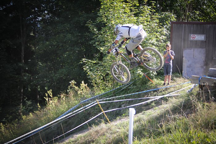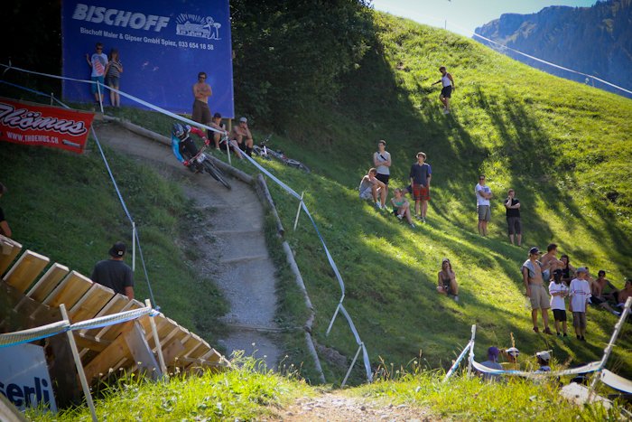 Чемпионат Швейцарии по даунхиллуПроехав три подряд эндуро гонки, решил снова вернуться к даунхиллу, подходящим эвентом показался IXS Swiss Downhill Cup, в местечке Wiriehorm (Diemtigtal), ведь именно там есть free категория для участников без лицензии UCI, которой у меня нет (собственно, потому что, как правило, для выступления в мастерах она не нужна). Предварительно мероприятие казалось относительно местечковым, но на деле все оказалось совсем не так… 300 (!!!) участников, каково? Сразу скажу — не очень люблю Швейцарию. В смысле горы и виды чудесны, зимой словил в Лааксе супер фрирайд, но менталитет свой, не близкий россиянам (в отличие, например, от французов). Возьмем регистрацию — отстояв в 8 утра очередь из 15 человек, подхожу к столику, дядя спрашивает фамилию, а молодой человек на листочке с моим номером ставит печать, мол, подошел такой-то, иду дальше, следующий милый дядя с усами говорит: плати за инфраструктуру 10 франков, говорю — мне не нужна инфраструктура, все равно плати, это обязательно. В итоге заплатил за обычные пластиковые туалеты-будки 340 рублей. Сходил пару раз, можно прикинуть стоимость. Была еще большая передвижная столовая, которой я тоже не пользовался. После этого он ставит печать на листочек, и я иду дальше, к девушке, которая снова ставит печать, и выдает мне номер, ски-пасс и (какая щедрость!) разовый талончик на кофе или пиво. А теперь внимание, стоимость регистрации! За неделю до гонки 75 франков, меньше чем за неделю 90 франков. Оплачивать можно только пэй-палом и, хотя регистрировался за несколько дней, взяли 78.8 франка, получилось 2688 рублей + сбор «за инфраструктуру», итого 3000 рублей за участие в гонке! Не поленился подсчитать свои попытки, получилось около 250 рублей за один спуск. Да и дорога не слишком дешевая, учитывая старт из Л2А, всего 420 км., примерно 210 до Женевы и еще столько же до цели. Навигатор вообще не знает такого места Wiriehorm, гугл мапс знает и пустил машину вокруг Женевского озера через Лозанну и Берн. Как только въезжаешь в Женеву, картина на дороге меняется, Французы ездят исключительно на микролитражках, здесь множество Порше, Феррари, классические авто и просто все в основном новые. Швейцария — страна с самым высоким уровнем жизни в мире, вокруг невероятно ухоженные луга, окрестности и дома «с картинки». Сама дорога — всего две полосы. Если вы хотите целенаправленно посетить соревы в Швейцарии, то лететь надо в Женеву или Цюрих, а потом, ввиду удаленности всех этих деревушек, лучше ехать на машине. Относительно близко добраться также получается из всем известного и популярного Морзина. Wiriehorm — деревня буквально в три дома, с одним кресельным подъемником, вокруг красивые горы высотой 2500 метров. Дедушка на парковке вообще не говорит по-английски, как и большинство его сородичей — швейцарцы самодостаточны. Поэтому уходит время просто соориентироваться. Как позже выяснилось, на гонке проблема с парковкой, и все места, выделенные под базовый лагерь, забиты под завязку, всего около шести парковок. Абсолютно все участники приезжают на шикарных, огромных автокемперах, разбивают сервисные зоны с палатками и ничем не отличаются от любой профессиональной команды. Вечером в пятницу нам еще удается без проблем найти отличное место «с краю» и разбить свой лагерь. Когда поднимался наверх, боялся, часть перепада отрежут, но оказалось сов